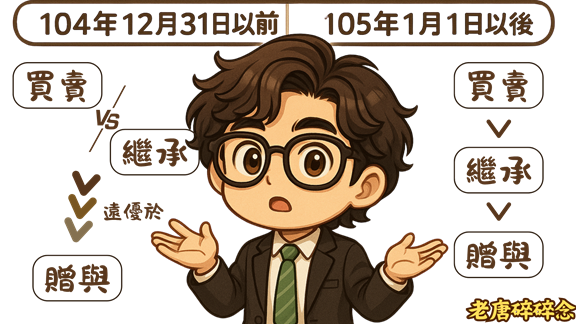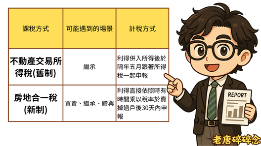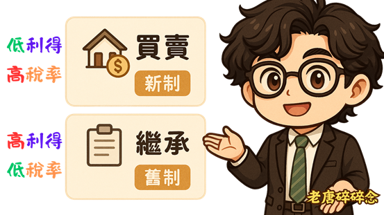 104年底前取得的房子,在稅制上可以選擇舊制(通常稅比較少),但只限「繼承」才可以選;買賣和贈與都一定走新制。