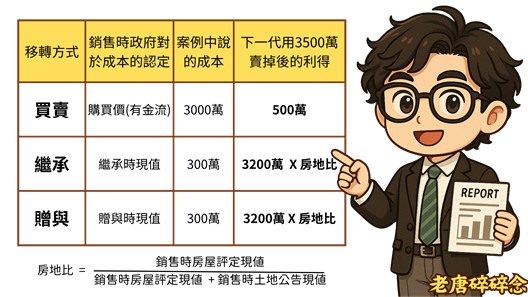 但如果你是用「贈與」或「繼承」,這個成本就會被認定為『房屋評定現值 + 土地公告現值』,而不是你當初買的價格!
