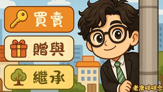 別擔心,今天老唐就用最簡單的方式,帶你看懂房產傳承的三大方式:「買賣」、「繼承」、「贈與」,到底差在哪裡。